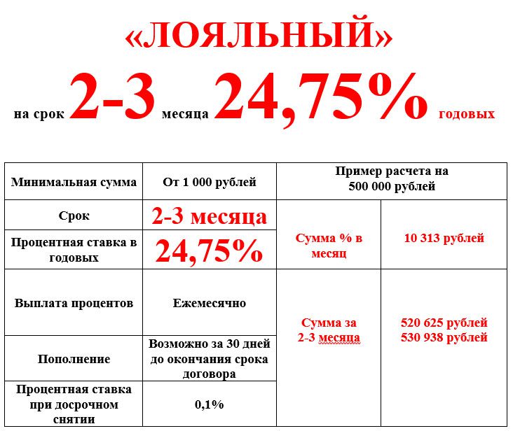 Договор передачи личных сбережений по программе “Лояльный” может быть заключен только с членами (пайщиками) КПКГ«ГорЗайм Урал» Не является публичной офертой. Член (пайщик) КПКГ«ГорЗайм Урал» обязан солидарно нести субсидиарную ответственность по своим обязательствам в пределах невнесенной части дополнительного взноса каждого из членов(пайщиков) КПКГ«ГорЗайм Урал». При вступлении в кооператив уплачивается обязательный паевой взнос 50 руб., вступительный взнос 50 руб. Заключение договора после ознакомления со всеми условиями в офисе. Дополнительную информацию об акции, условиях, сроках и месте ее проведения можете получить в офисах КПКГ«ГорЗайм Урал» или по тел.8 8-800-511-04-51